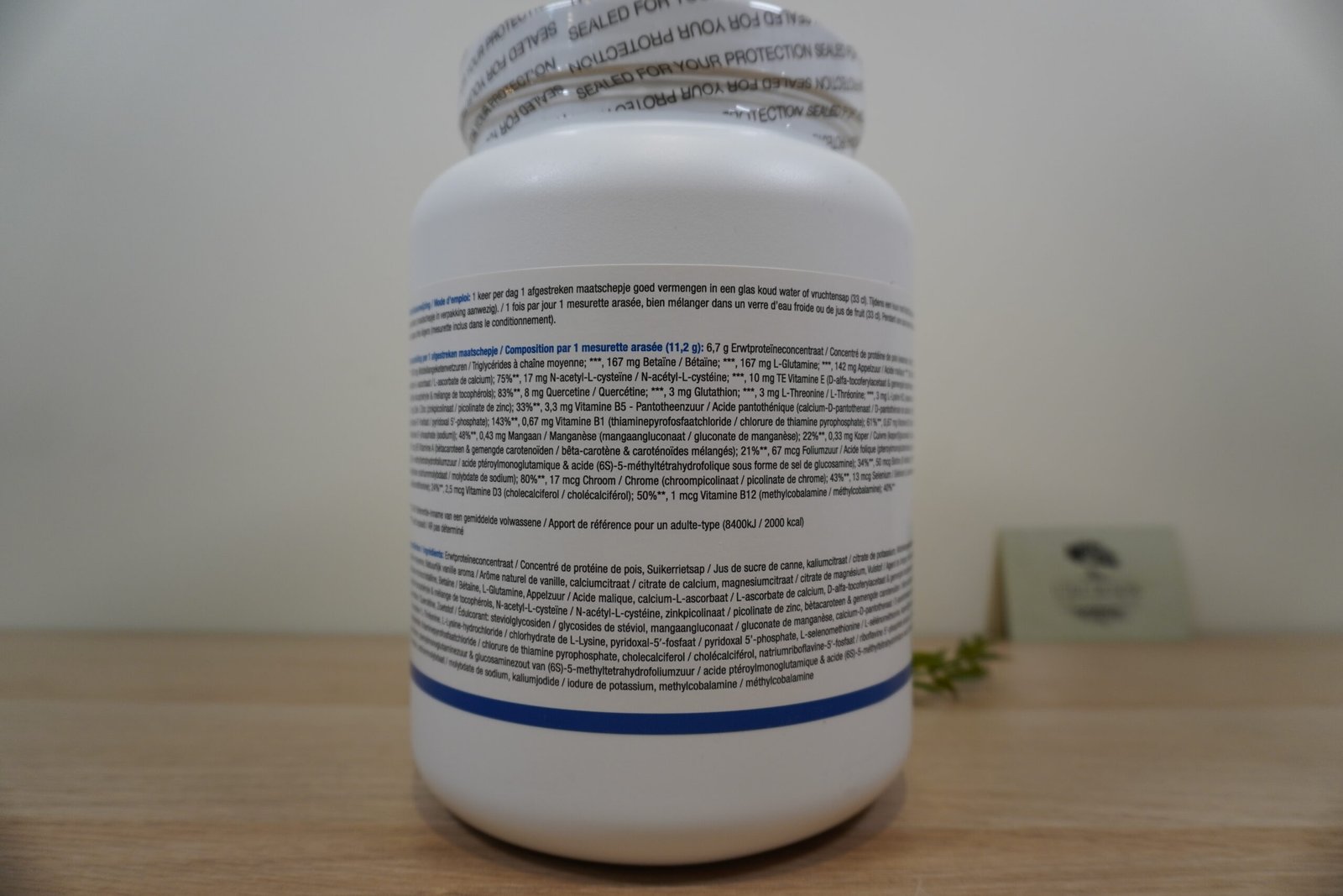 Concentré de protéine de petits pois, édulcorants : jus de canne à sucre, citrate de potassium, triglycérides à chaîne moyenne, arôme naturel de vanille, citrate de calcium, citrate de magnésium, cellulose microcristalline, bétaïne, L-glutamine, acide malique, L-ascorbate de calcium, D-alpha-tocophérol, mélange de tocophérols, N-acétyl-L-cystéine (NAC), zinc picolinate, bêta-carotène, caroténoïdes mélangés, quercétine, glycosides de stéviol, gluconate de manganèse, pantothénate de D-calcium, L-glutathion, L-thréonine, L-lysine HCl, pyridoxal-5’-phosphate, L-sélénométhionine, gluconate de cuivre, chlorure de thiamine pyrophosphate, cholécalciférol, riboflavine-5’’-phosphate de sodium, chrome picolinate, acide ptéroylmonoglutamique, (6S)-5-méthyltétrahydrofolate (sel de glucosamine), D-biotine, molybdate de sodium, méthylcobalamine.