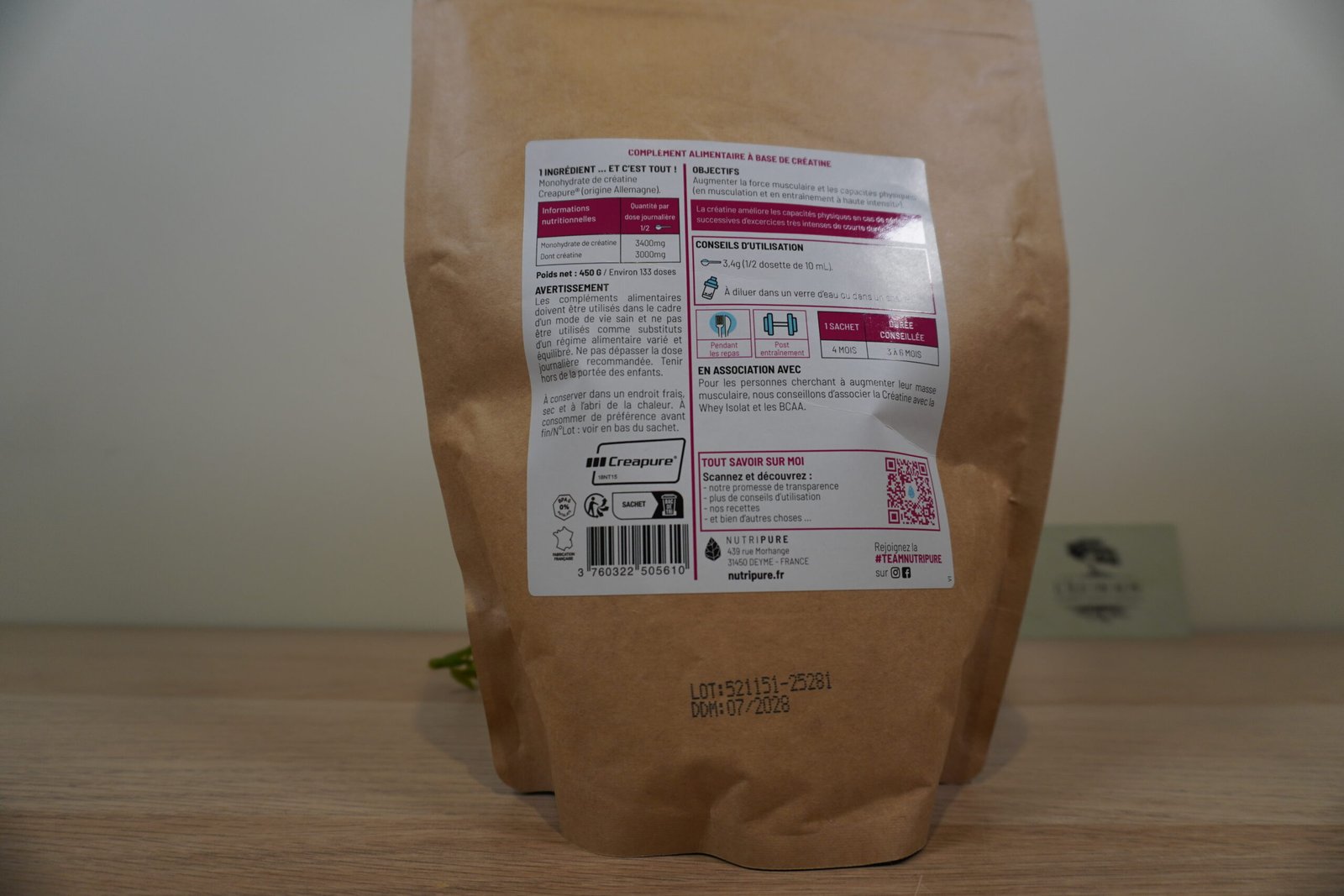 Sachet de 150g de Nutripure – Créatine poudre est un complément alimentaire à base de monohydrate de créatine Creapure®, forme pure et hautement assimilable de créatine. Il aide à améliorer la performance lors d’exercices successifs de courte durée et de haute intensité.